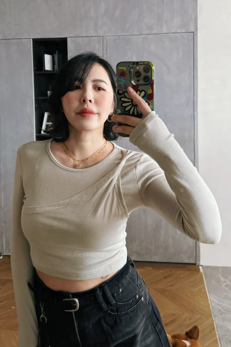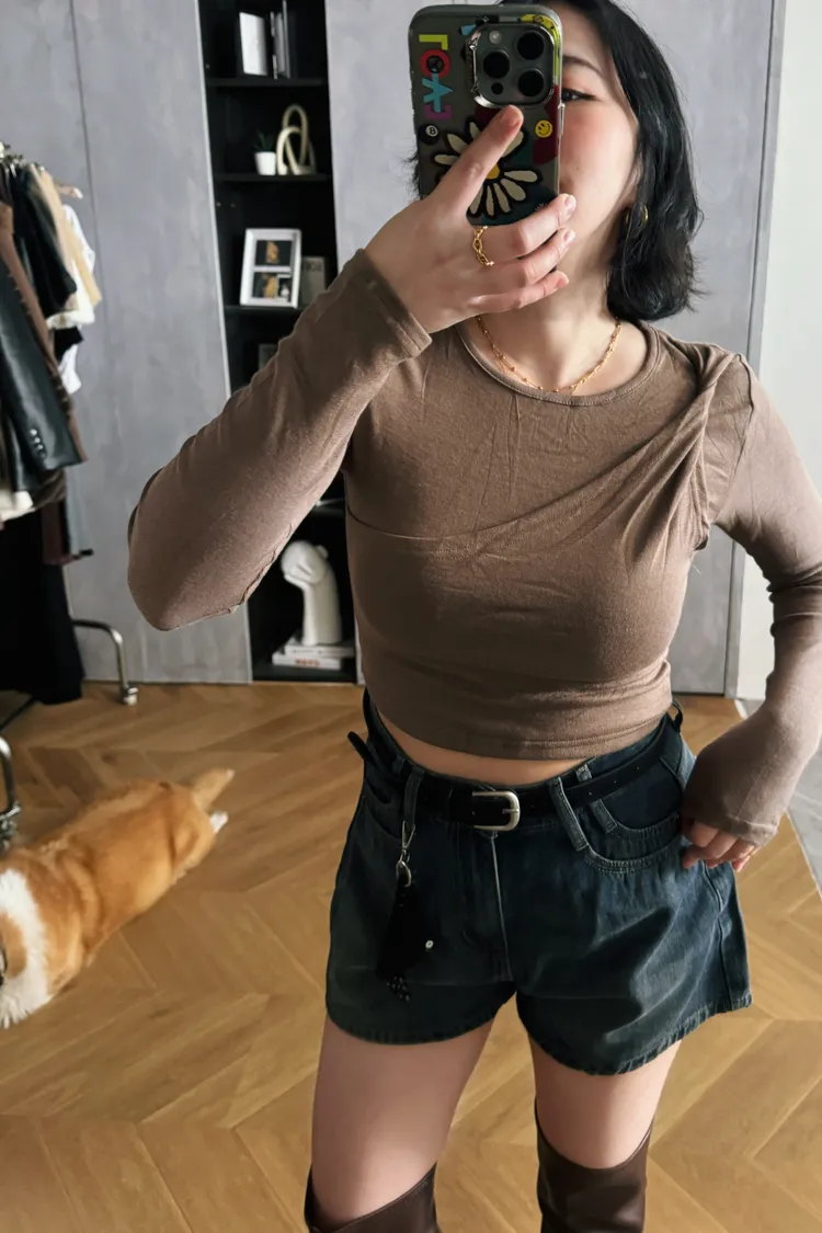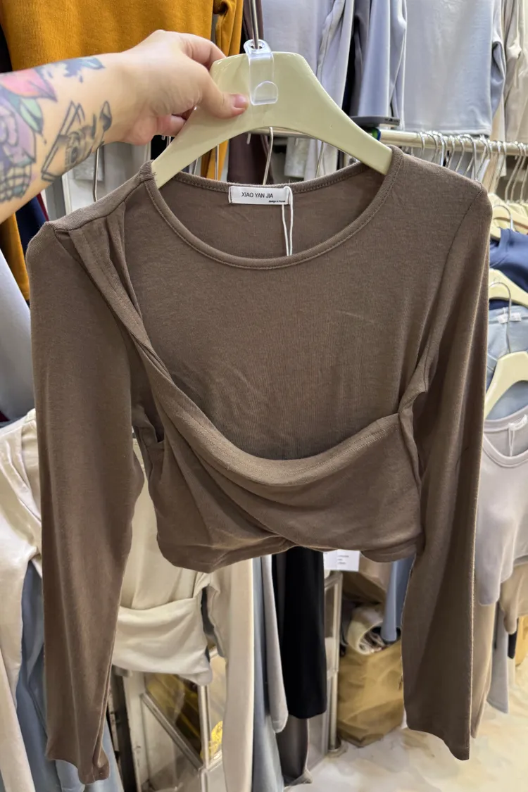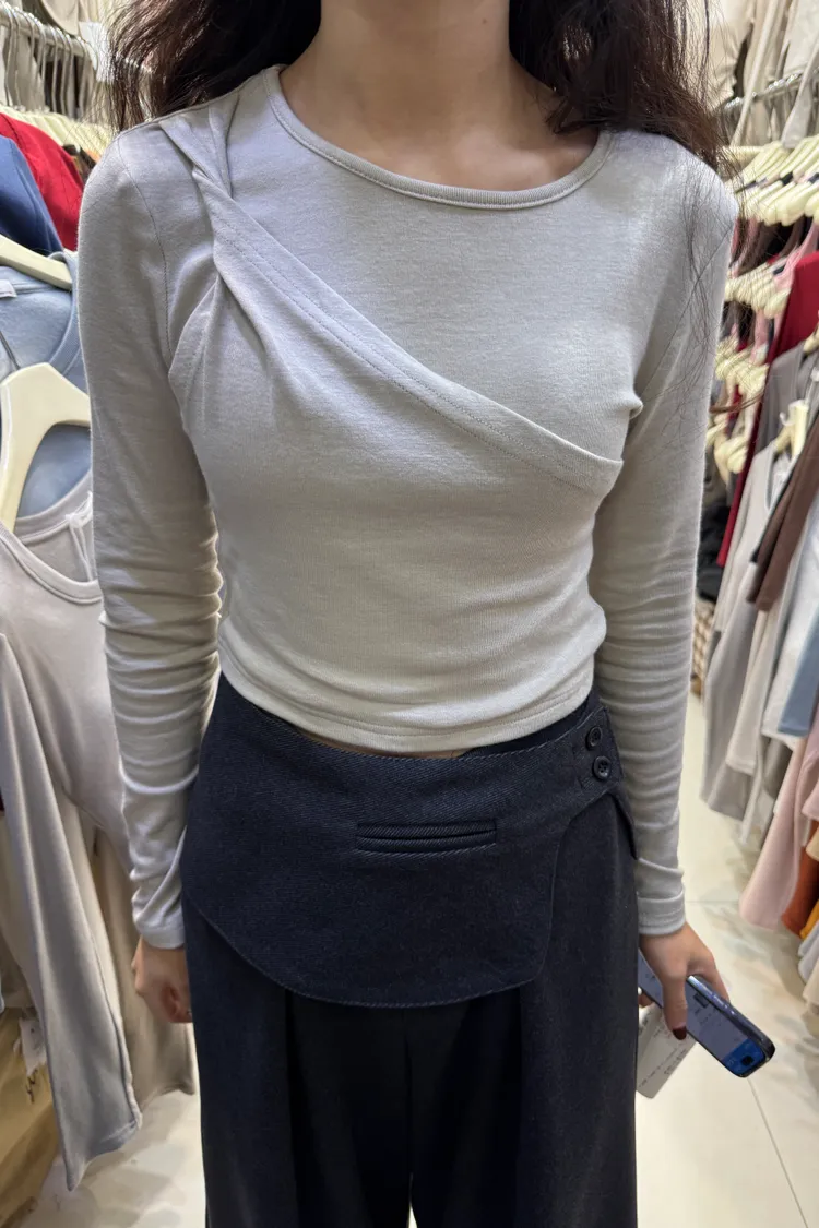 斜捲肩假兩件韓國棉T