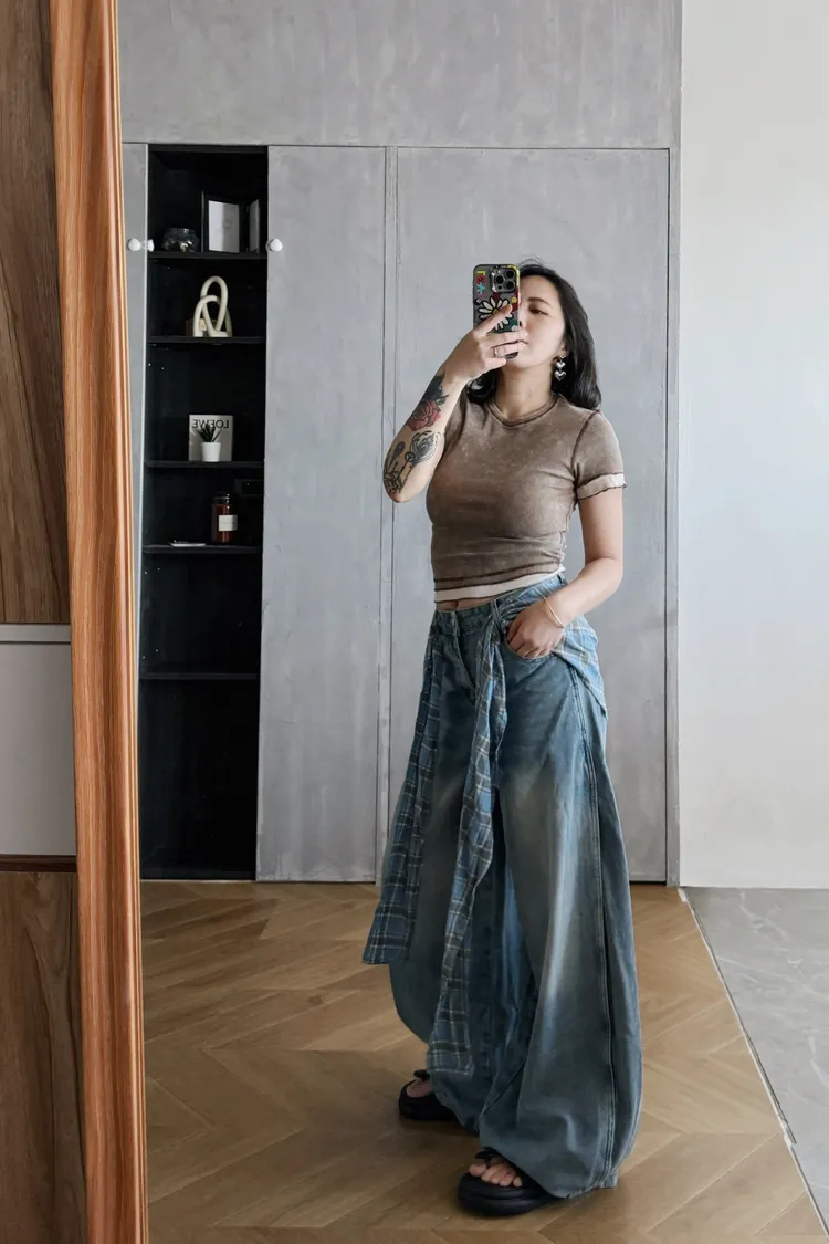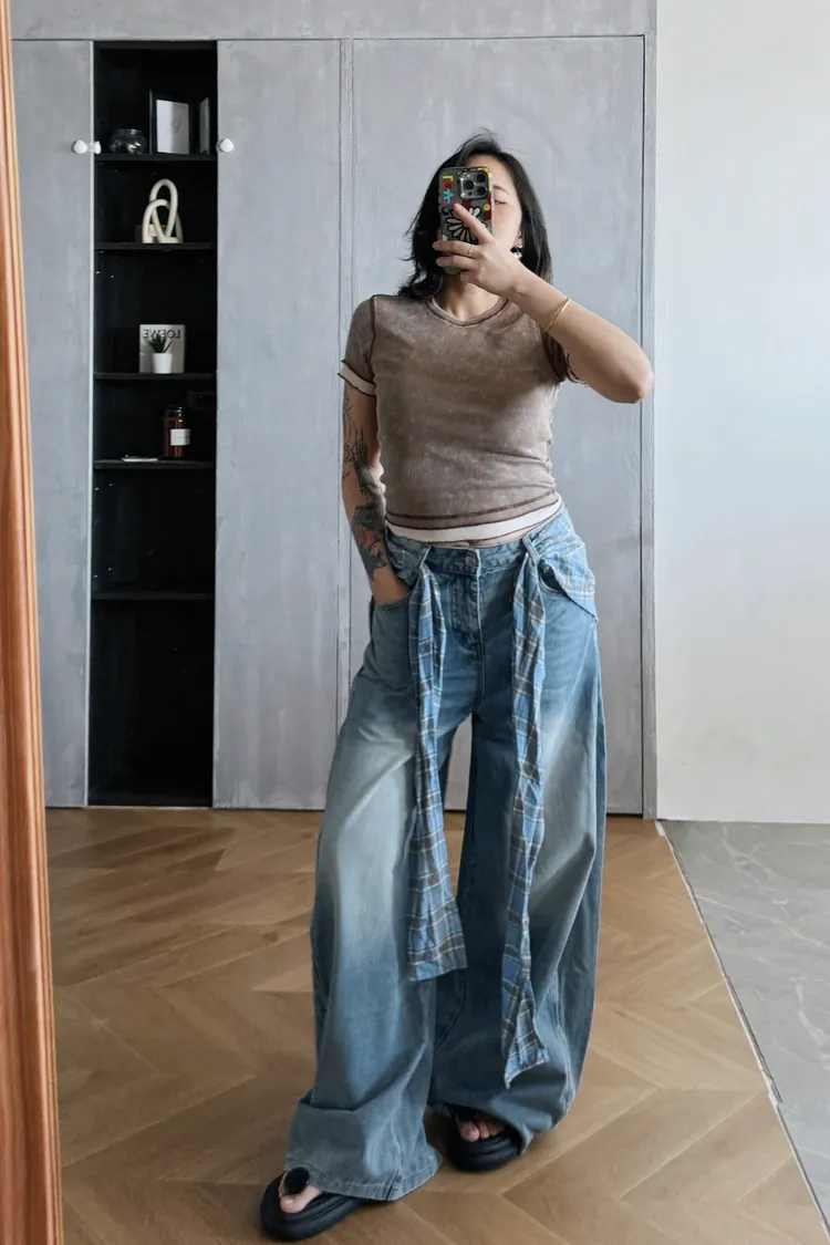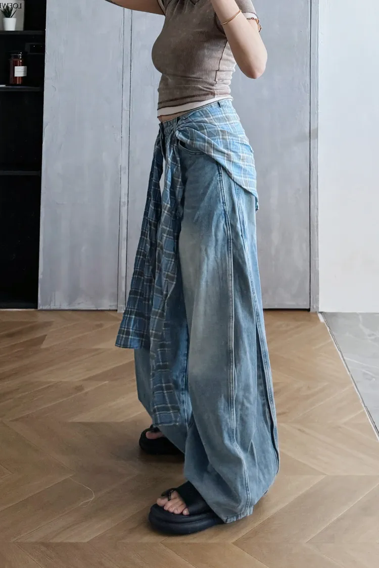 格子屁簾牛仔落地寬褲